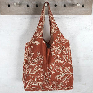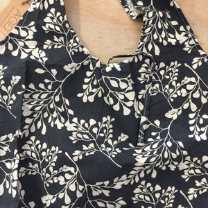 These Apple Green Duck, Hampi, shopping bags are made with 100% cotton, are screen printed, have wide shoulder straps, are a generous and roomy size, with a tie at the top to keep the bag contents secure and will easily fold away and be secured back into a small roll when not in use.