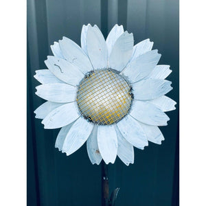 Design features a painted white metal Daisy head on a rustic metal plant stem.