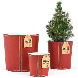 The flex pots are thinner and more flexible than our standard pots, making it easier to manoeuvre large plants and Christmas trees in and out of the pots. Their unique design means they are even lighter than our standard pots and stack nicely for transport and storage. The Gold Stars pots have an embossed star pattern created from recycled paper whilst the Red Pots have a smooth finish with white stitch feature. Using the paper offcuts from production of the paper pottery to create their own handmade embossed paper designs ensures no excess waste is created.