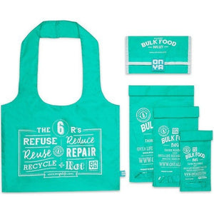 Our bulk food bag set contains a large, medium and small bulk food bag along with our specially designed bulk food shopping tote. They are all conveniently stored in our innovative bulk food carry case which comes with an attached carabiner that can be clipped on to your bag and belt so you always have your bags On Ya.