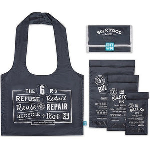 The Reusable Bulk Food Bag Set includes the Carry Case and Tote Bag, along with a Small, Medium and Large Bulk Bag.