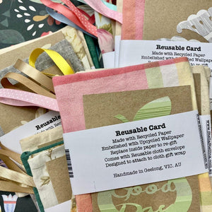Gorgeous, REUSABLE (!!!) Greeting Cards in 5 delightful designs, hand made from reused and upcycled materials. Give one of these charming cards and know that it can be used over and over again, simply by replacing the inner message paper each time.