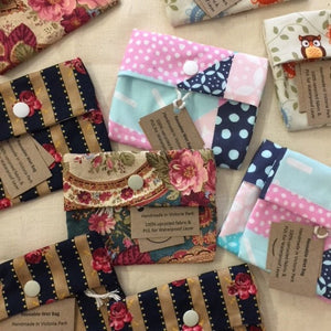A convenient reusable storage pouch made from 100% upcycled fabric with a water-proof PUL lining to neatly carry used cloth pads (or anything soiled or wet) when out and about.