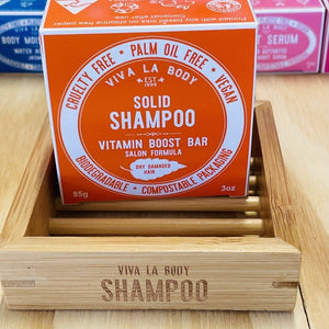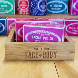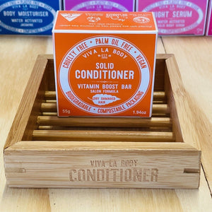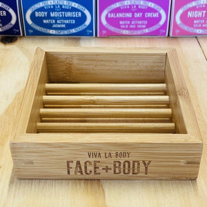 A fit-for-purpose open-slatted bamboo soap dish especially designed to keep all your Viva La Body solid Shampoo, Conditioner, Face and Body Soap bars well drained and organised in your bathroom! These dishes are all labeled so you don't forget which bar is which in your shower.