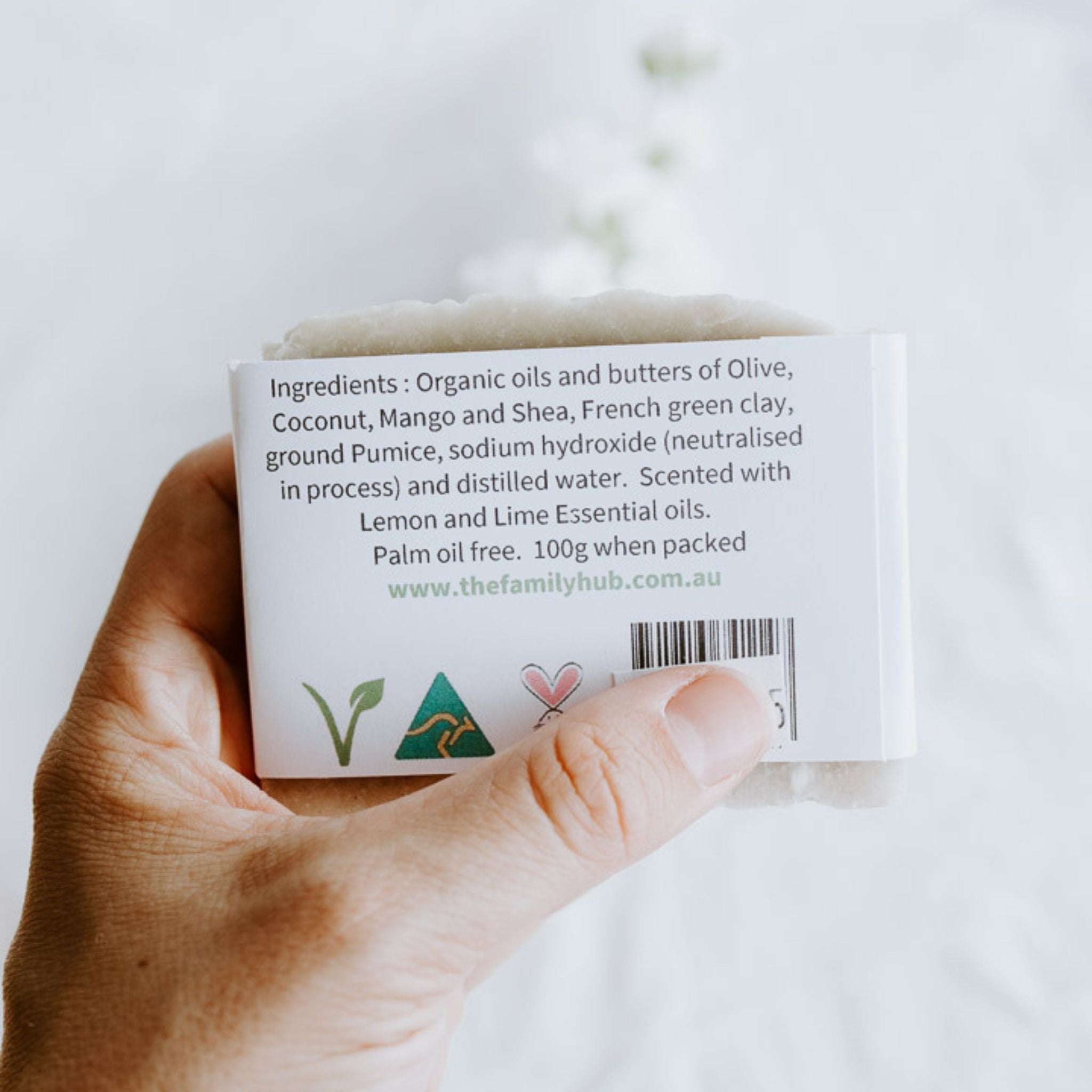 Ingredients: Saponified Organic Oils and Butters of Olive, Coconut, Mango, Castor, Unsaponified Mango Butter, Distilled Water, Ground Pumice, French Green Clay, Lemon and Lime Essential Oils.
