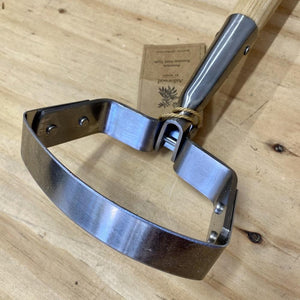 The stainless steel oscillating or stirrup hoe works on both the push and pull motion by cutting and pulling weeds just under the soil surface so as to not disturb nearby plants and surrounding soil life. The backwards and forwards motion rids the blade of any weeds which have built up, the oscillation action ensures the blade is at the optimum angle to the soil.