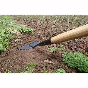 This heavy duty weeding hoe is made by Ryset, with a tough, tempered, abrasion resistant steel blade that holds the edge longer.