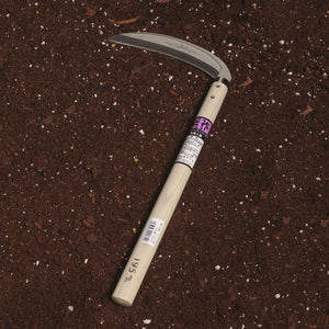 This Mikaduki Grass Sickle by NISAKU is a top-of-the-line tool constructed from Japanese stainless steel that has been heat-treated and finely sharpened. The curved, non-serrated blade is expertly fitted to a high-grade wooden handle, and is traditionally employed for cutting grass, standing weeds, leaf crops, cut flowers, herbs and softer foliage.