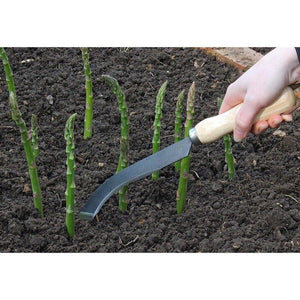A unique tool combining the two most popular methods of cutting asparagus: Serrated blade saws through the stem under the surface of the soil or the sharpened tip slices through the spear.