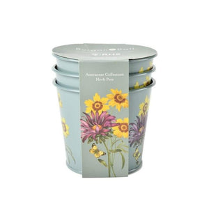 Made from galvanised steel with a durable powder coating, these herb pots will brighten up any windowsill. Perfect for planting kitchen herbs as well as flowers. The purple and yellow Asteraceae design pops from the soft sage background, featuring beautiful China aster and coreopsis flowers.