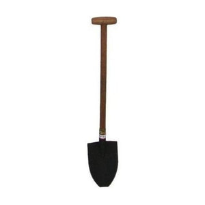 Small curved spade with sharp tapered face, 600mm x 28mm spotted gum T handle, blade dimensions are 220mm high x 140mm wide with a curved tapered face. High carbon steel, heat-treated and sharpened for easy soil penetration. Ideal size and shape for digging small planting holes in existing garden beds. Perfect when a normal spade is too big.