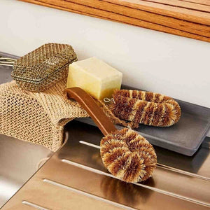 The Eco Max Dish Brush is handmade from a natural vegetable fibre found in the husk of the mature coconut. Coconut fibre is naturally antibacterial so it won’t become smelly or mouldy, is chemical-free, long-lasting and is completely plastic-free.
