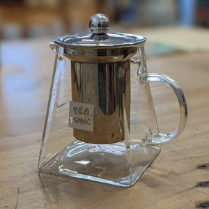 The tea pot has a two cup capacity (400mL) with fine stainless steel infuser basket. Perfect for use with our Roogenics teas and for any loose leaf tea infusions.