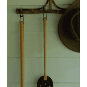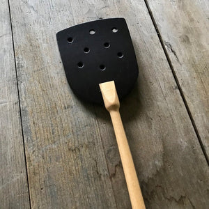 The swat is made with oiled leather, it has a beech wood handle and a leather strap for hanging.