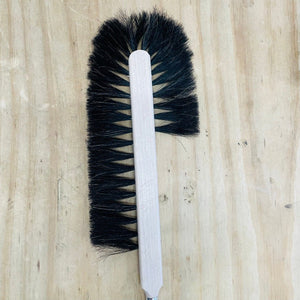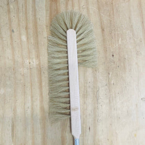 Handcrafted from horsehair and beechwood with a leather strap, this brush cleans up dust and spiderwebs behind cupboards, in narrow corners, eaves, and off high walls.