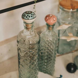 Elevate your wine & oil bottles with these stunning yet practical bottle stoppers! The Blue Pottery of Jaipur's master craftsmanship can be seen in the intricately hand painted detail and lead-free glaze. Chunky and handcrafted, these stoppers bring functional beauty to your space with their vibrant hues and gold metallic accents.