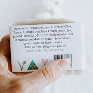 Ingredients: Saponified Organic Oils and Butters of Olive, Coconut, Mango, Castor, Unsaponified Mango Butter, Distilled Water, Ground Pumice, French Green Clay, Lemon and Lime Essential Oils.