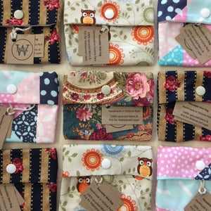 A convenient reusable storage pouch made from 100% upcycled fabric with a water-proof PUL lining to neatly carry used cloth pads (or anything soiled or wet) when out and about.