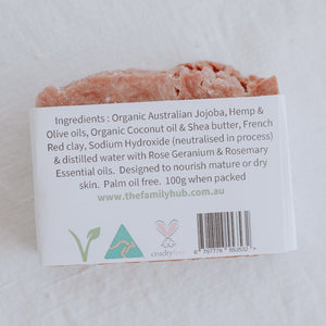 Organic Australian Jojoba, Hemp & Olive oils, Organic Coconut oil & Shea butter, French Red Clay, Sodium Hydroxide (neutralised in process) & distilled water with Rose Geranium & Rosemary Essential oils.