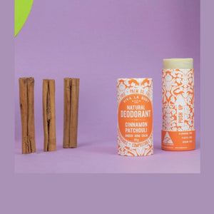Magnesium Hydroxide, Cocos nucifera (Coconut Oil), Tapioca Starch, Butyrospermum Parkii Butter (Shea Butter), Caprylic/Capric Triglyceride (from Coconut), Euphorbia Cerifera Cera (Candelilla Wax), Simmondsia Chinensis Seed Oil (Jojoba Oil), Bran Wax (Rice Bran Wax), Pogostemon Cablin (Patchouli Oil), Cinnamomum Zeylanicum (Cinnamon).