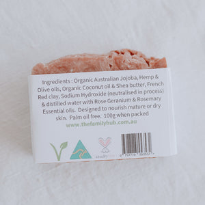 Organic Australian Jojoba, Hemp & Olive oils, Organic Coconut oil & Shea butter, French Red Clay, Sodium Hydroxide (neutralised in process) & distilled water with Rose Geranium & Rosemary Essential oils.