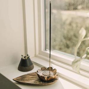 This solid wood incense holder from North Central India features a beautiful hand-carved lotus design with five incense stick holders. Designs are crafted using age-old techniques and require an expert level of master woodworking to create a polished finish. Ethically made with respect to the local culture.