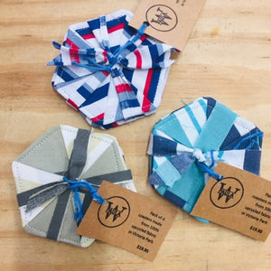Keep your furniture safe from those pesky ring marks with these 100% Upcycled Fabric Coasters. Cleverly made with seven layers of fabric featuring a funky origami style design, these are not only practical, but stylish and each one is unique due to nature of using upcycled fabrics for their creation.