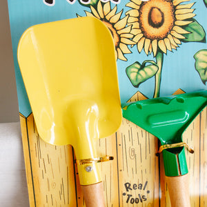 Real kids gardening tools, made for tiny hands. Inspire a love of gardening in the smaller people around you with this gorgeous set of sturdy, plastic-free childrens gardening tools. Also great for sandcastles and muddy games... Includes a shovel, rake and trowel.