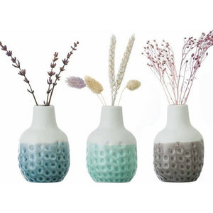At just 10cm tall, these stoneware vases are delightfully dainty. Each vase holds one or two stems of fresh or dried flowers for a display with impact, just right for a table centrepiece. Echoing the dip glaze and eye-catching dimpled pattern of the much-loved Baby Dotty Hanging Pot, the vases feature complementary tones of aqua, petrol blue and a soft mushroom shade – greige, you might call it. Whether displayed singly or as a group, the Dotty mini vases look gorgeous even when empty, picture-perfect on fireplace, windowsill or shelf.