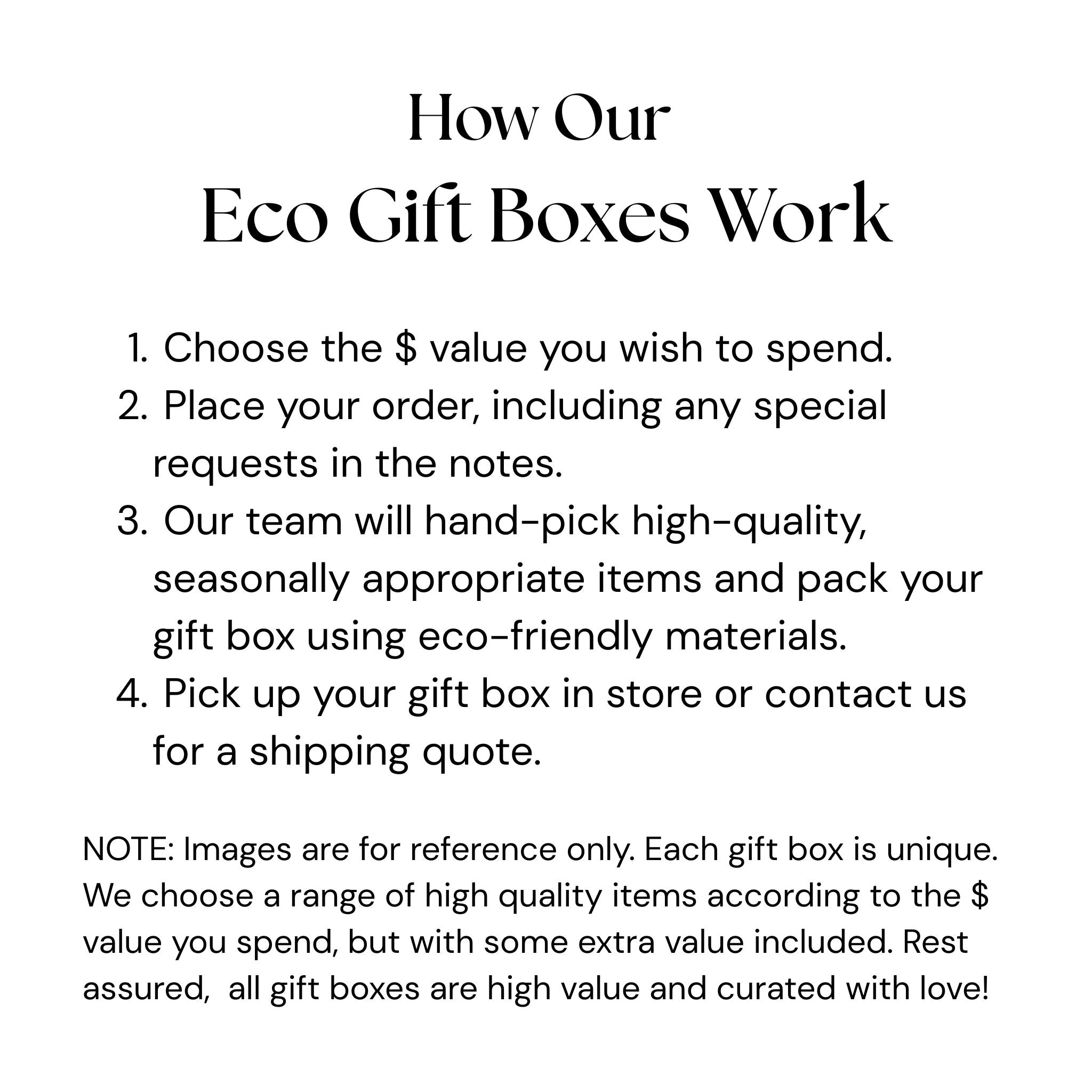 Choose the dollar value you would like the contents of your gift box to be and we will do the rest!