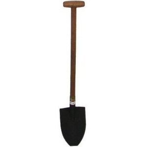 Small curved spade with sharp tapered face, 600mm x 28mm spotted gum T handle, blade dimensions are 220mm high x 140mm wide with a curved tapered face. High carbon steel, heat-treated and sharpened for easy soil penetration. Ideal size and shape for digging small planting holes in existing garden beds. Perfect when a normal spade is too big.