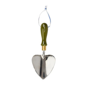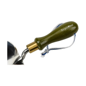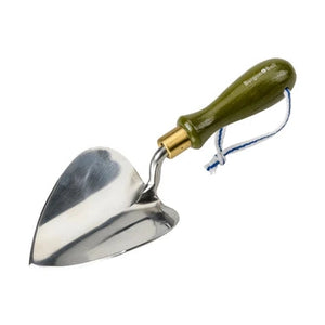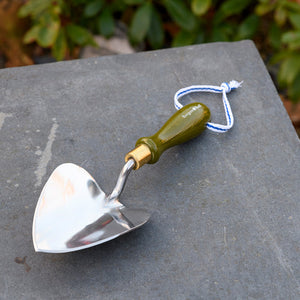 This versatile planting trowel has a painted wooden handle in a beautiful olive green. The heart-shaped trowel made from polished stainless steel is highly resistant rust, so it'll stay beautiful for years to come. The ferrule (handle fitting) is solid brass, bringing a beautiful warm highlight to the look. There’s a striped cotton hanging cord for easy storage.